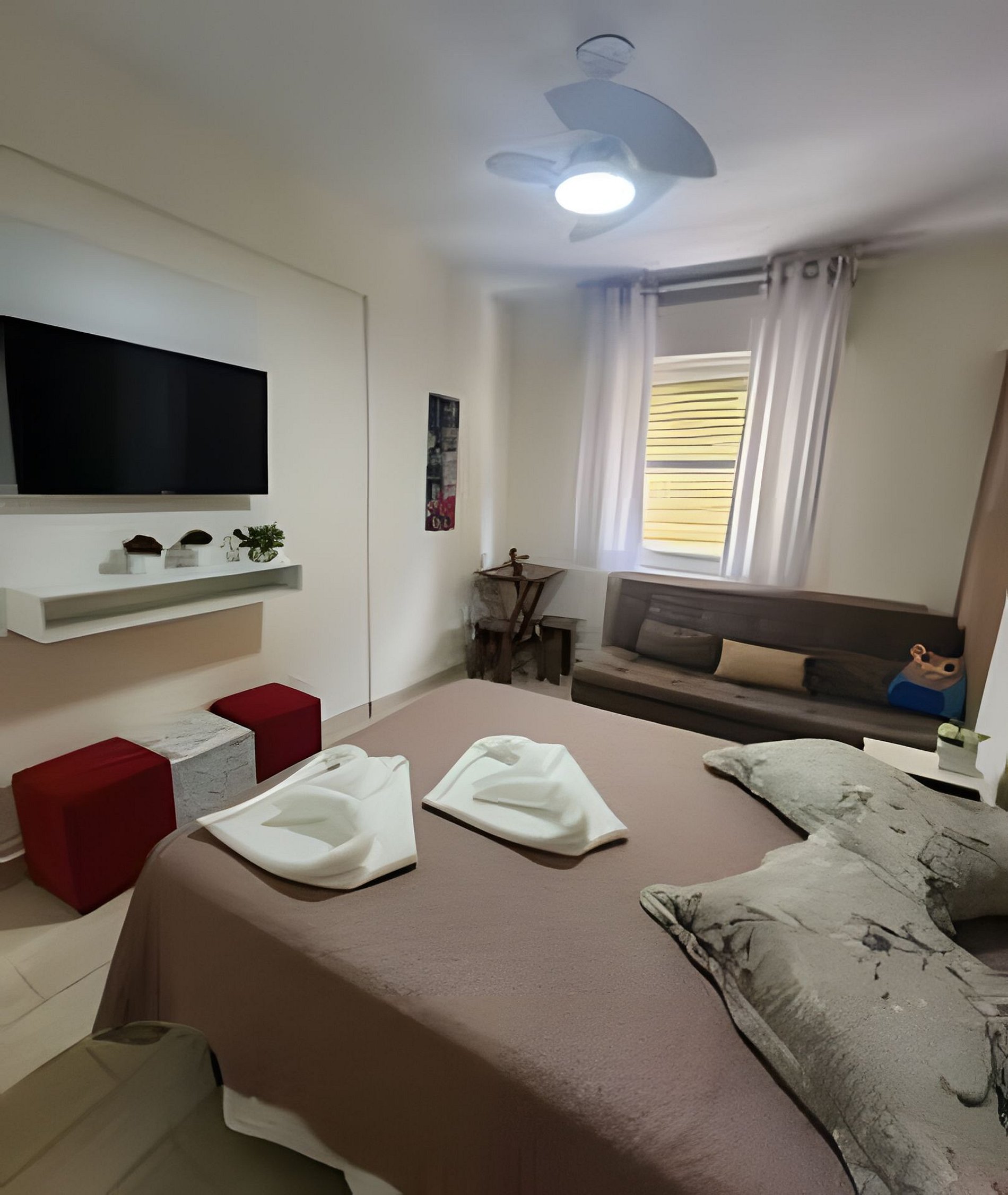 Possui uma cama de casal e um bicama (cama de solteiro, com cama auxiliar), tv, ventilador de teto, janela antirruído que abre totalmente, com tela mosquiteira e cortina com blackout.