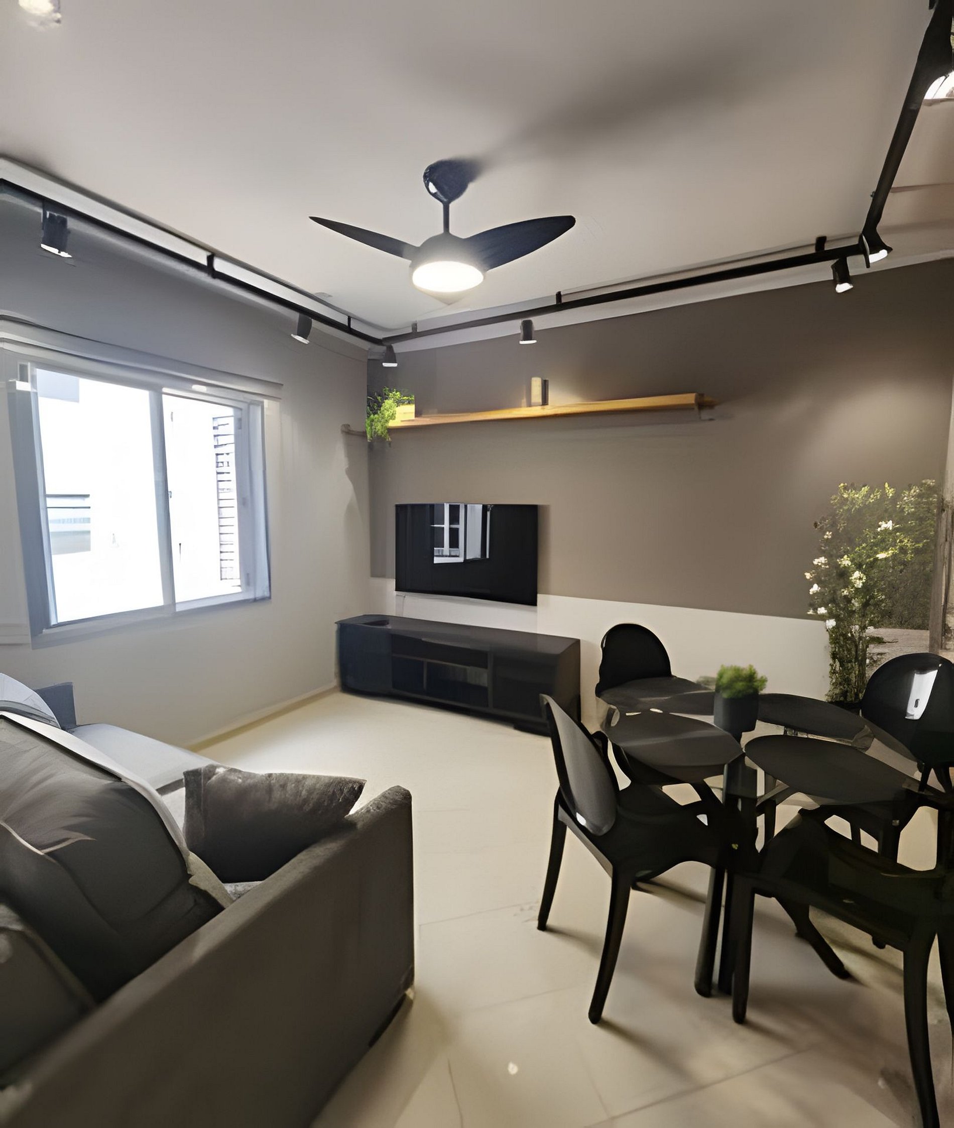 O apartamento possui ar condicionado no quarto, ventilador de teto, Wi-Fi , televisão na sala, cafeteira, microondas, geladeira, fogão, sanduicheira, utensílios de cozinha.