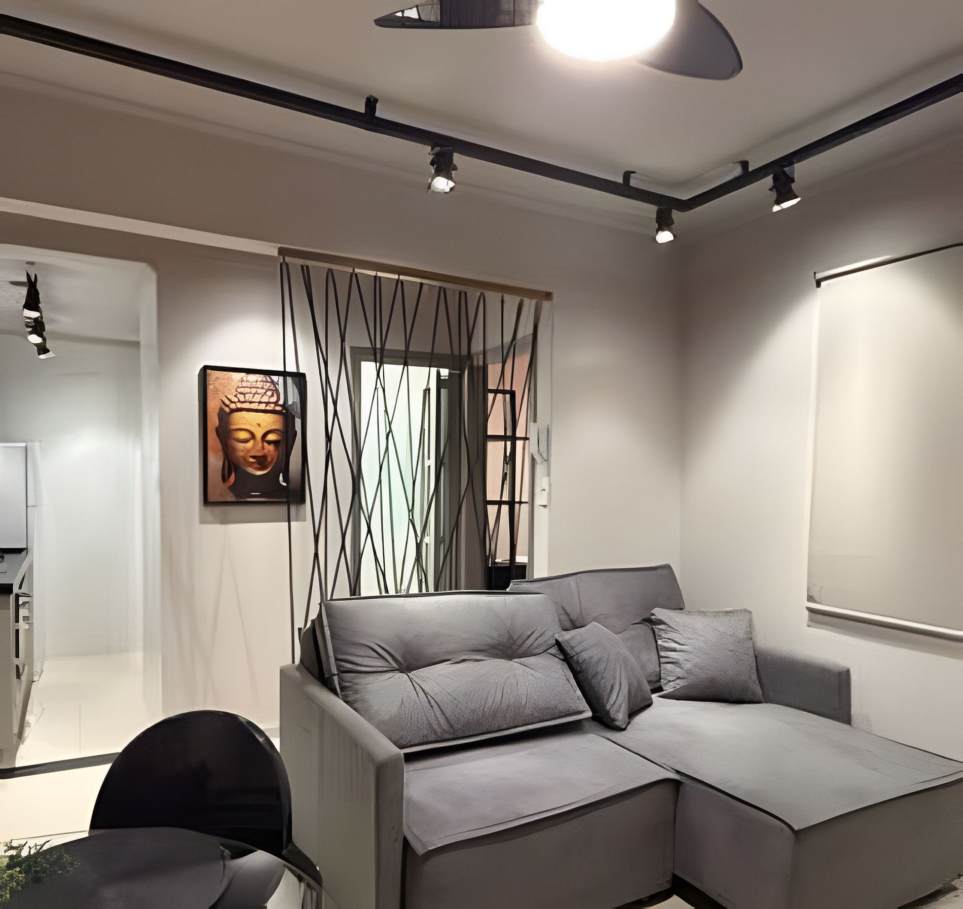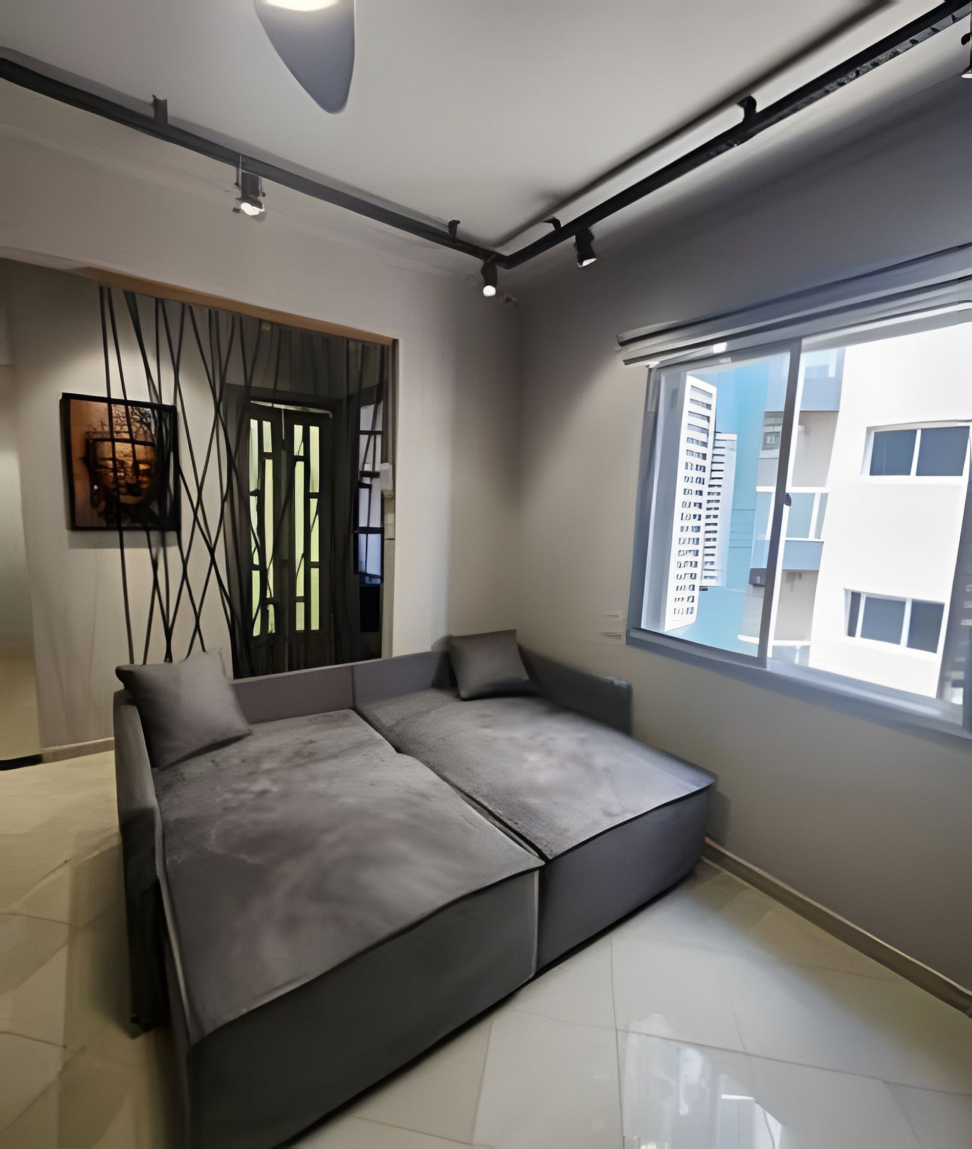 Apartamento de um dormitório com uma cama de casal no quarto e um sofá cama na sala.