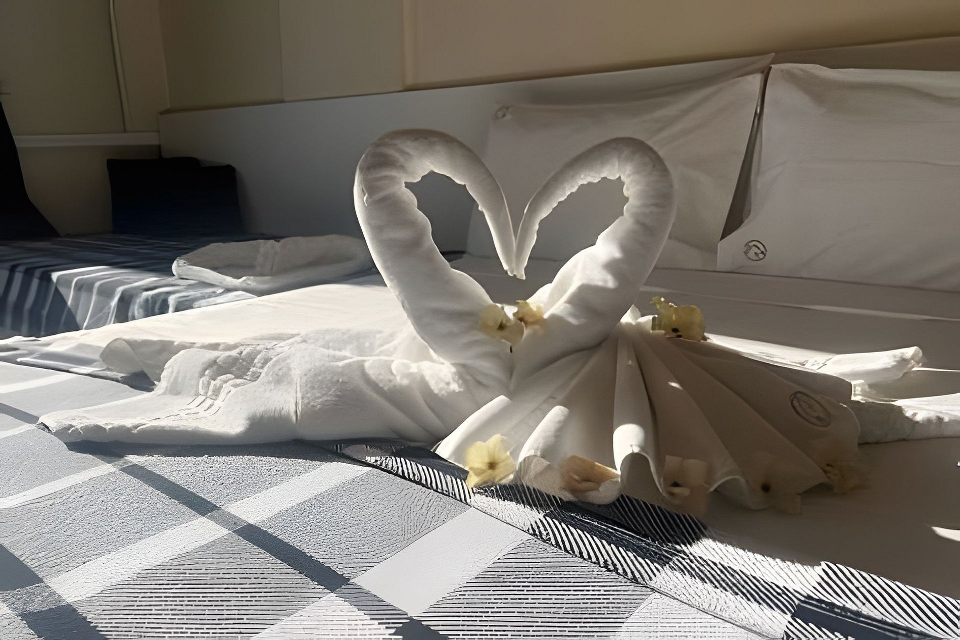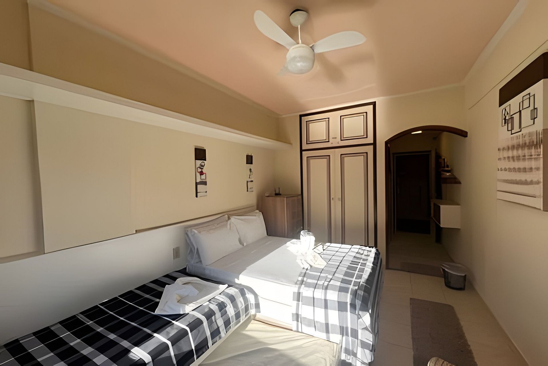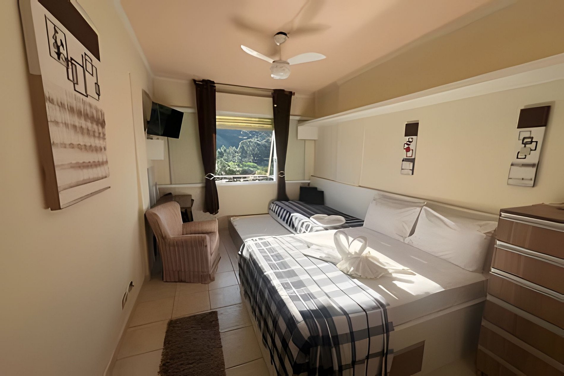 Possui uma cama de casal e um bicama (cama de solteiro, com cama auxiliar), tv, ventilador de teto, janela antirruído que abre totalmente, com tela mosquiteira e cortina com blackout.