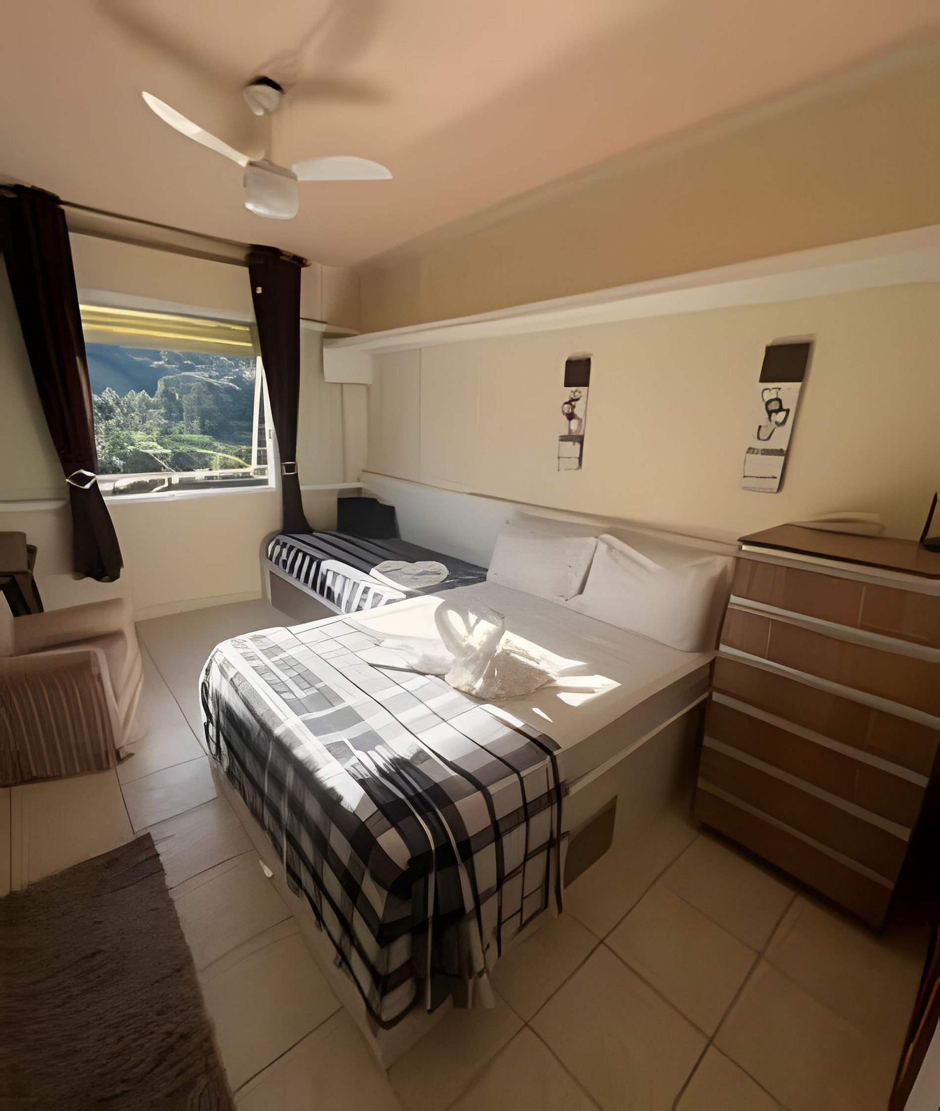 Possui uma cama de casal e um bicama (cama de solteiro, com cama auxiliar), tv, ventilador de teto, janela antirruído que abre totalmente, com tela mosquiteira e cortina com blackout.