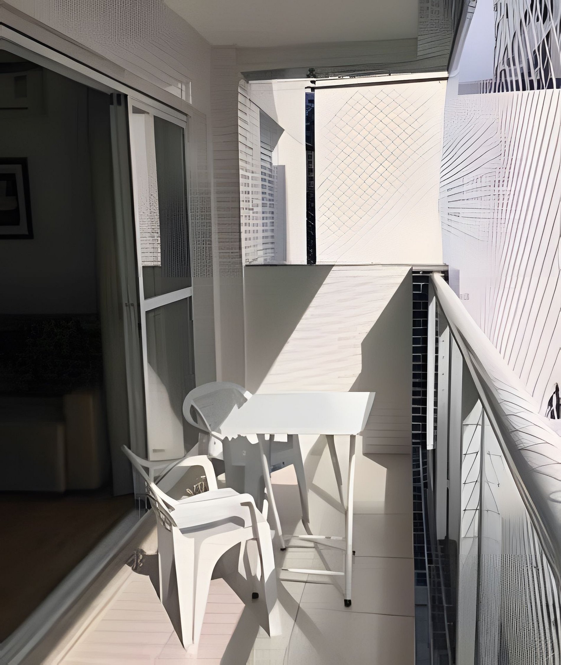 Varanda ampla com mesa e cadeiras, ar condicionado na sala e no quarto, dois banheiros sendo 1 suíte e 1 lavabo, microondas, fogão, cafeteira, purificador de Água, liquidificador, máquina de lavar, televisão na sala e no quarto, Wi-Fi, utensílios para cozinha
